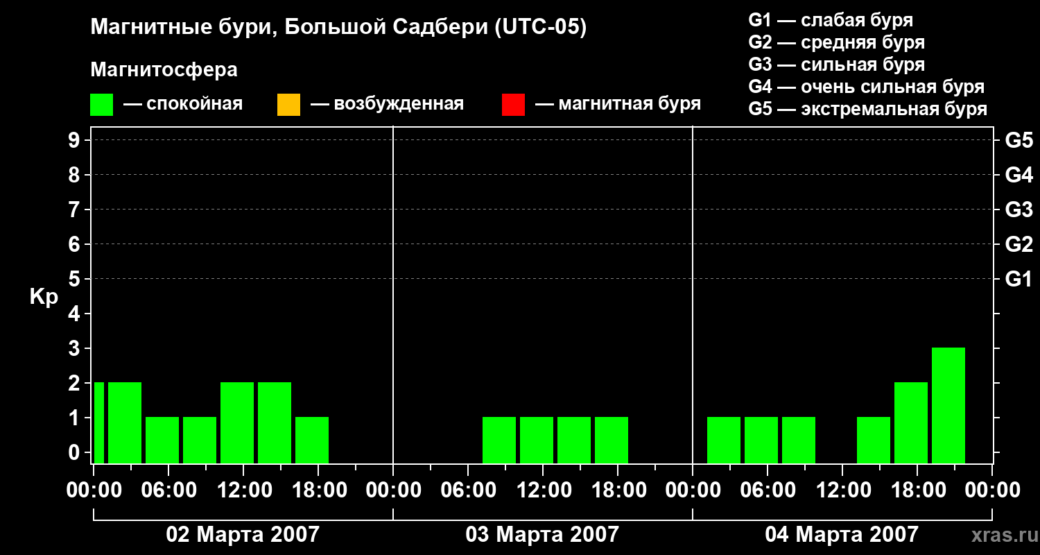 Изменения геомагнитного индекса Kp с 2 по 4 марта 2007 года для средних широт
