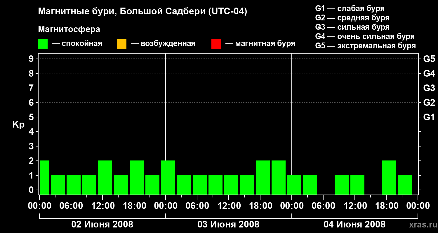 Изменения геомагнитного индекса Kp с 2 по 4 июня 2008 года для средних широт