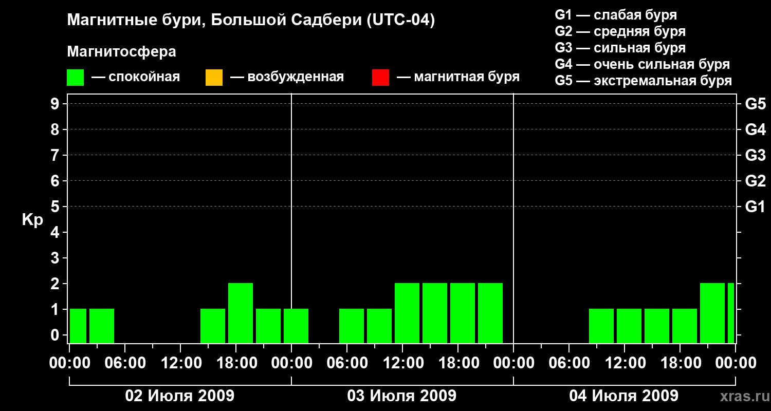 Изменения геомагнитного индекса Kp с 2 по 4 июля 2009 года для средних широт