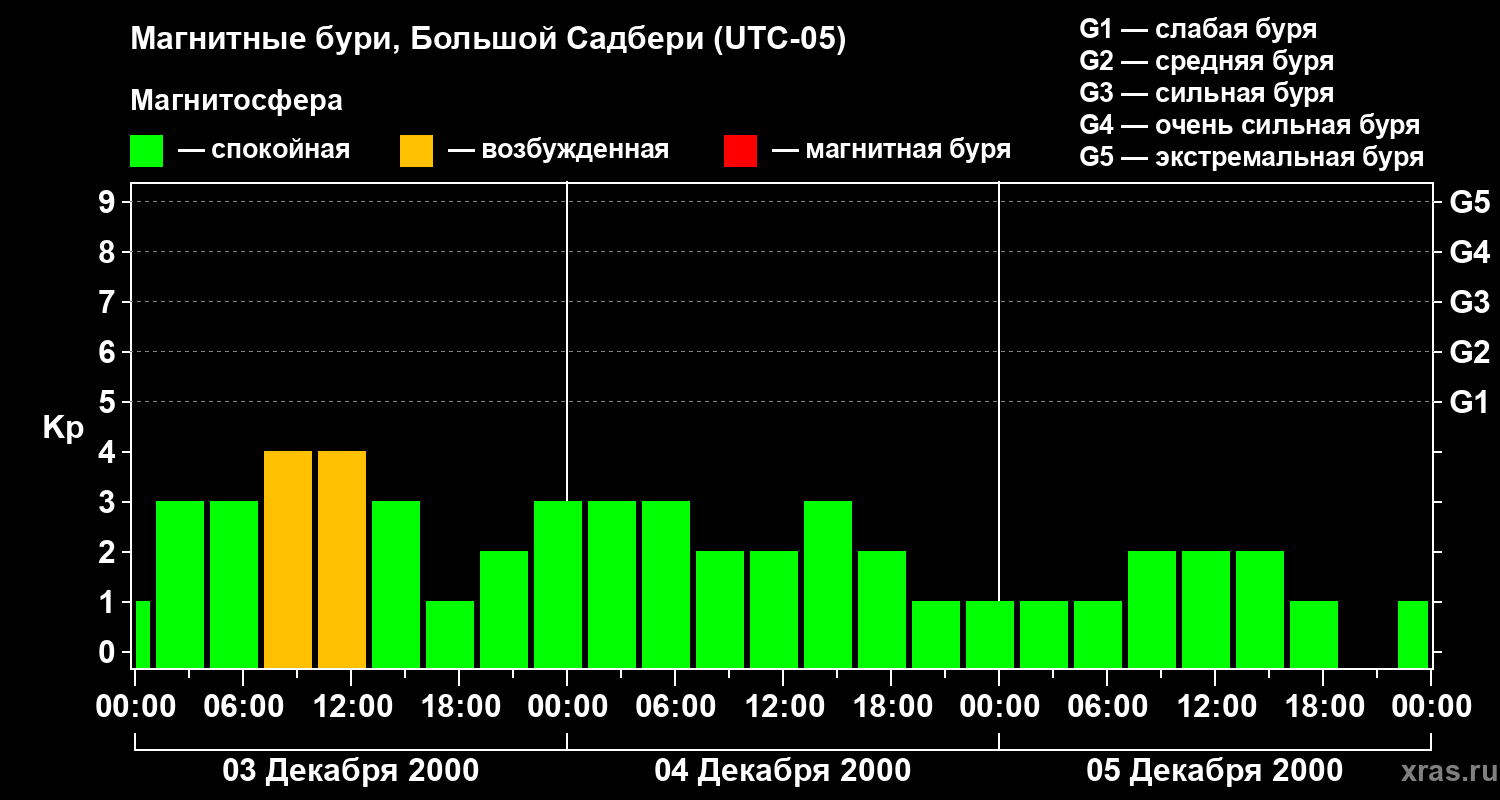 Изменения геомагнитного индекса Kp с 3 по 5 декабря 2000 года для средних широт