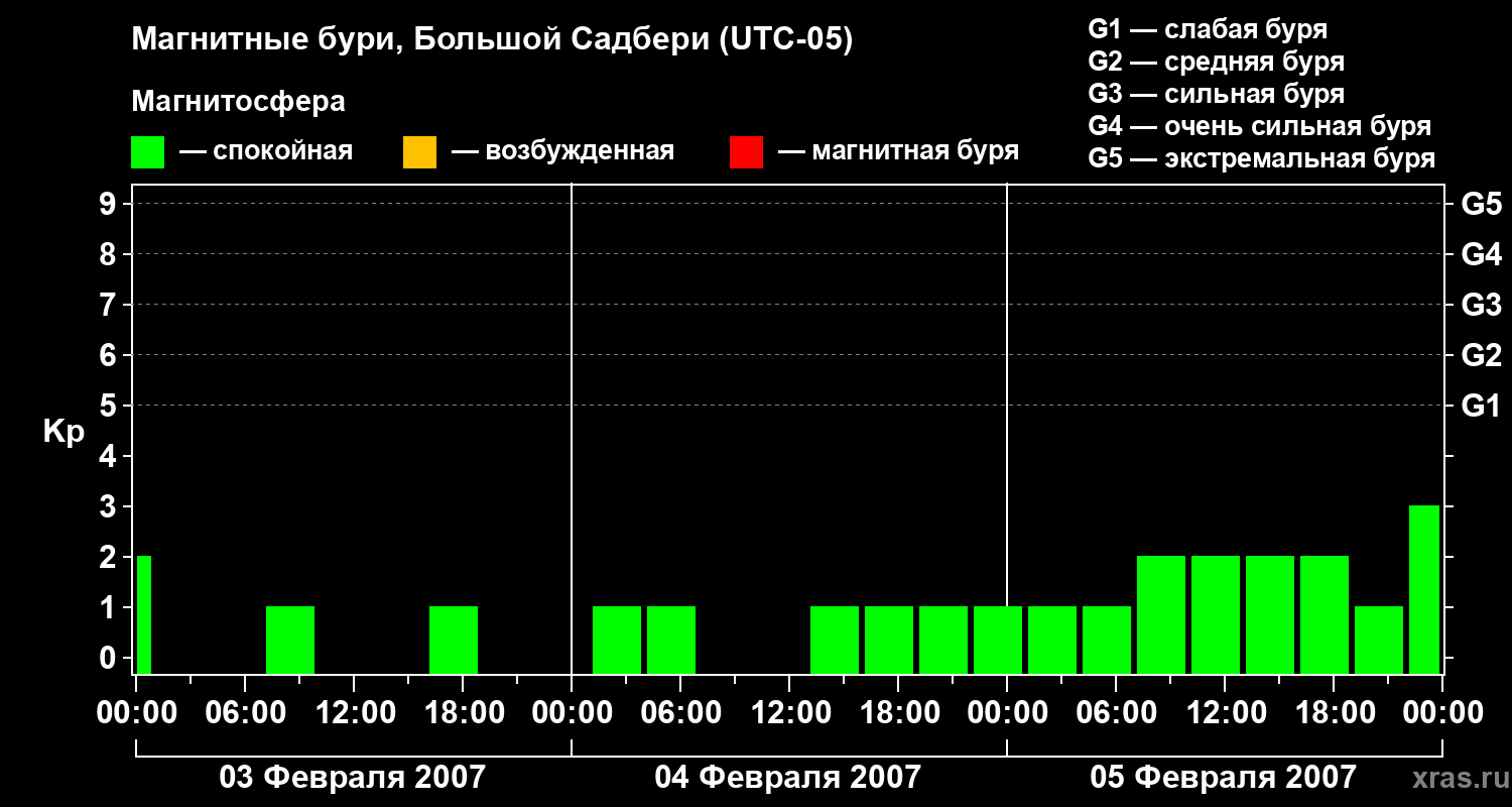 Изменения геомагнитного индекса Kp с 3 по 5 февраля 2007 года для средних широт