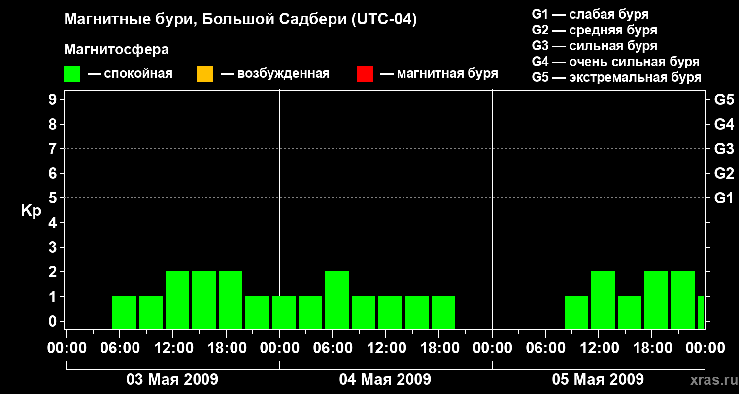 Изменения геомагнитного индекса Kp с 3 по 5 мая 2009 года для средних широт