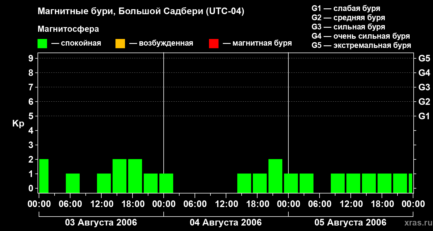 Изменения геомагнитного индекса Kp с 3 по 5 августа 2006 года для средних широт