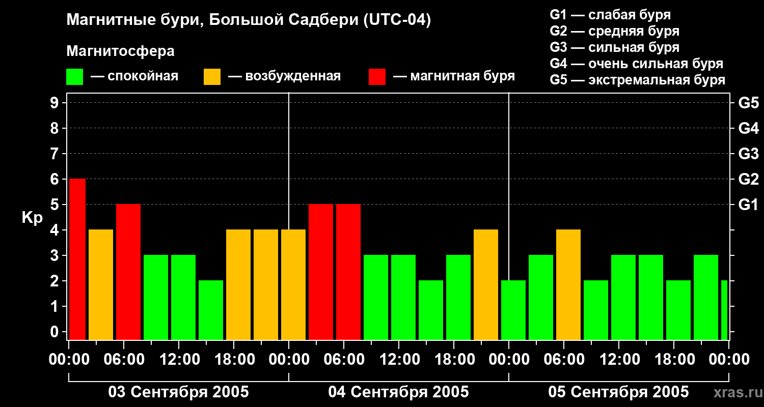 Изменения геомагнитного индекса Kp с 3 по 5 сентября 2005 года для средних широт