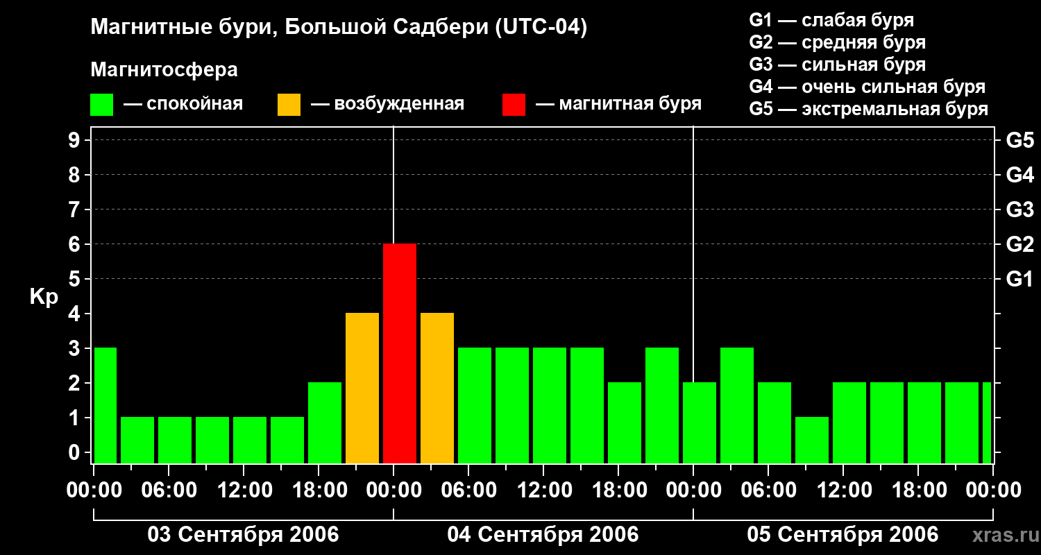 Изменения геомагнитного индекса Kp с 3 по 5 сентября 2006 года для средних широт