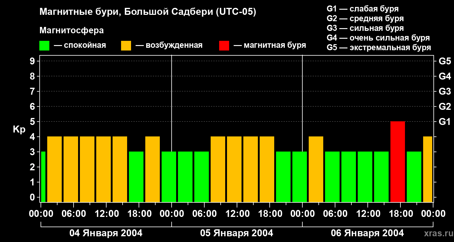 Изменения геомагнитного индекса Kp с 4 по 6 января 2004 года для средних широт