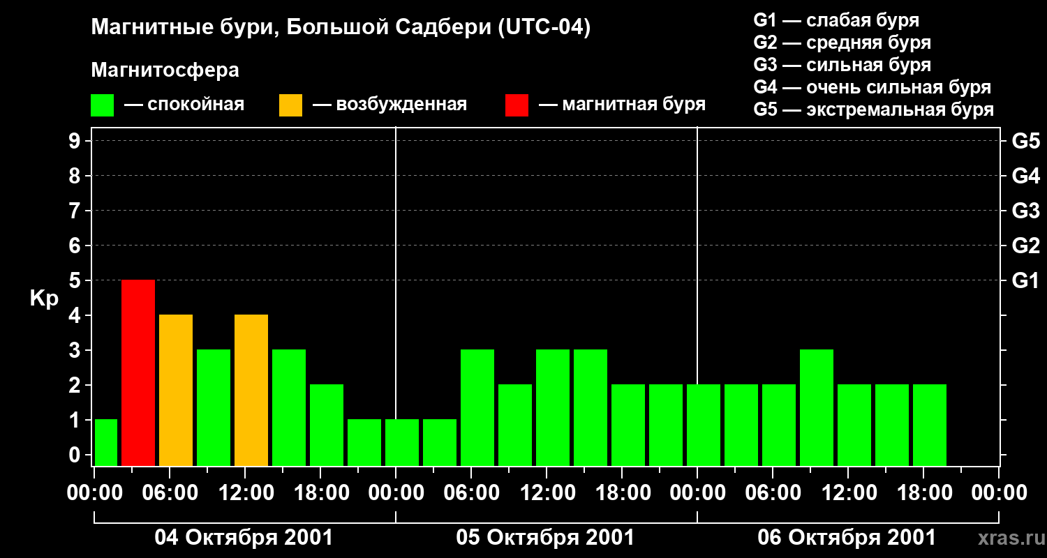 Изменения геомагнитного индекса Kp с 4 по 6 октября 2001 года для средних широт