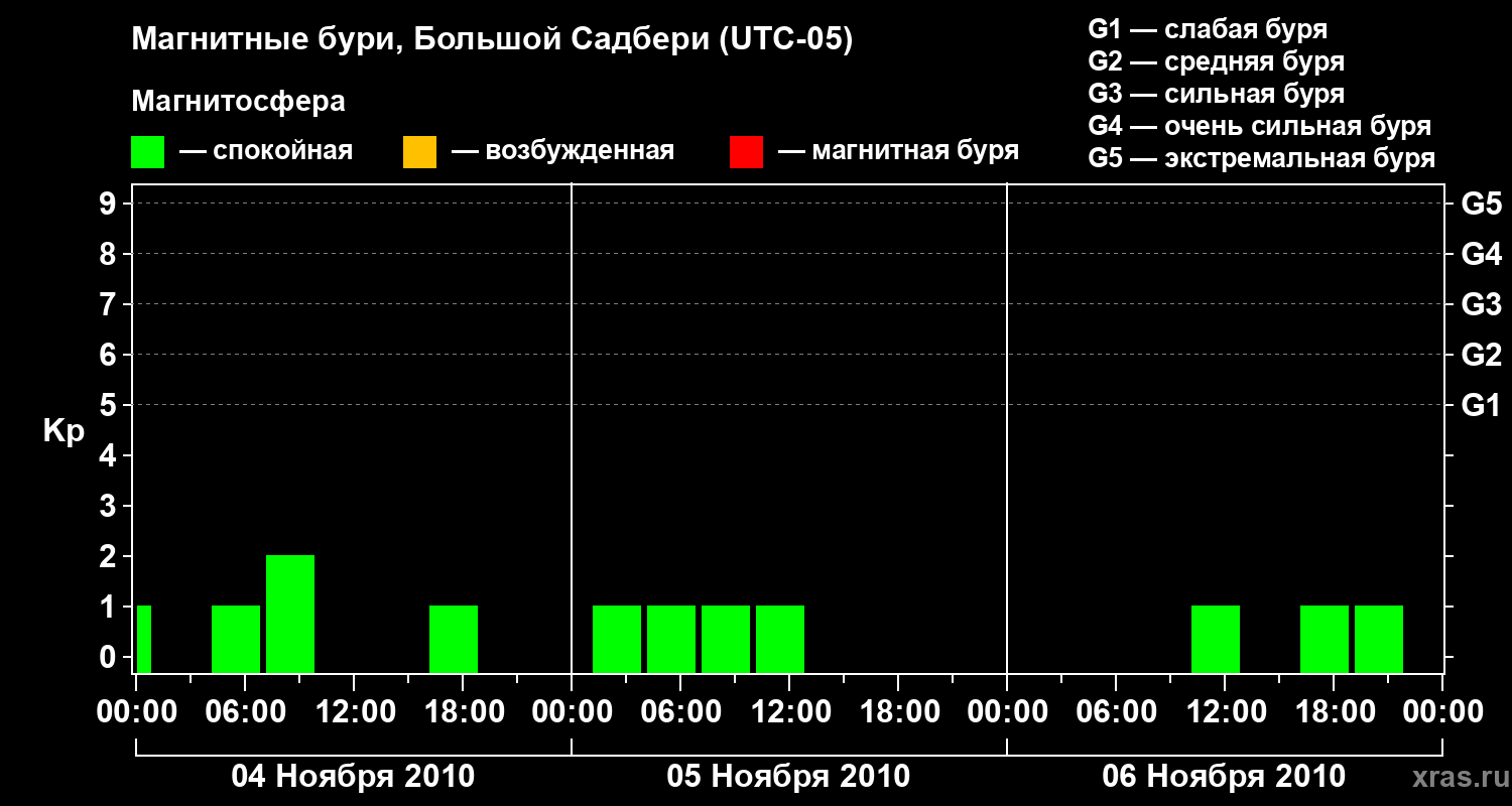Изменения геомагнитного индекса Kp с 4 по 6 ноября 2010 года для средних широт
