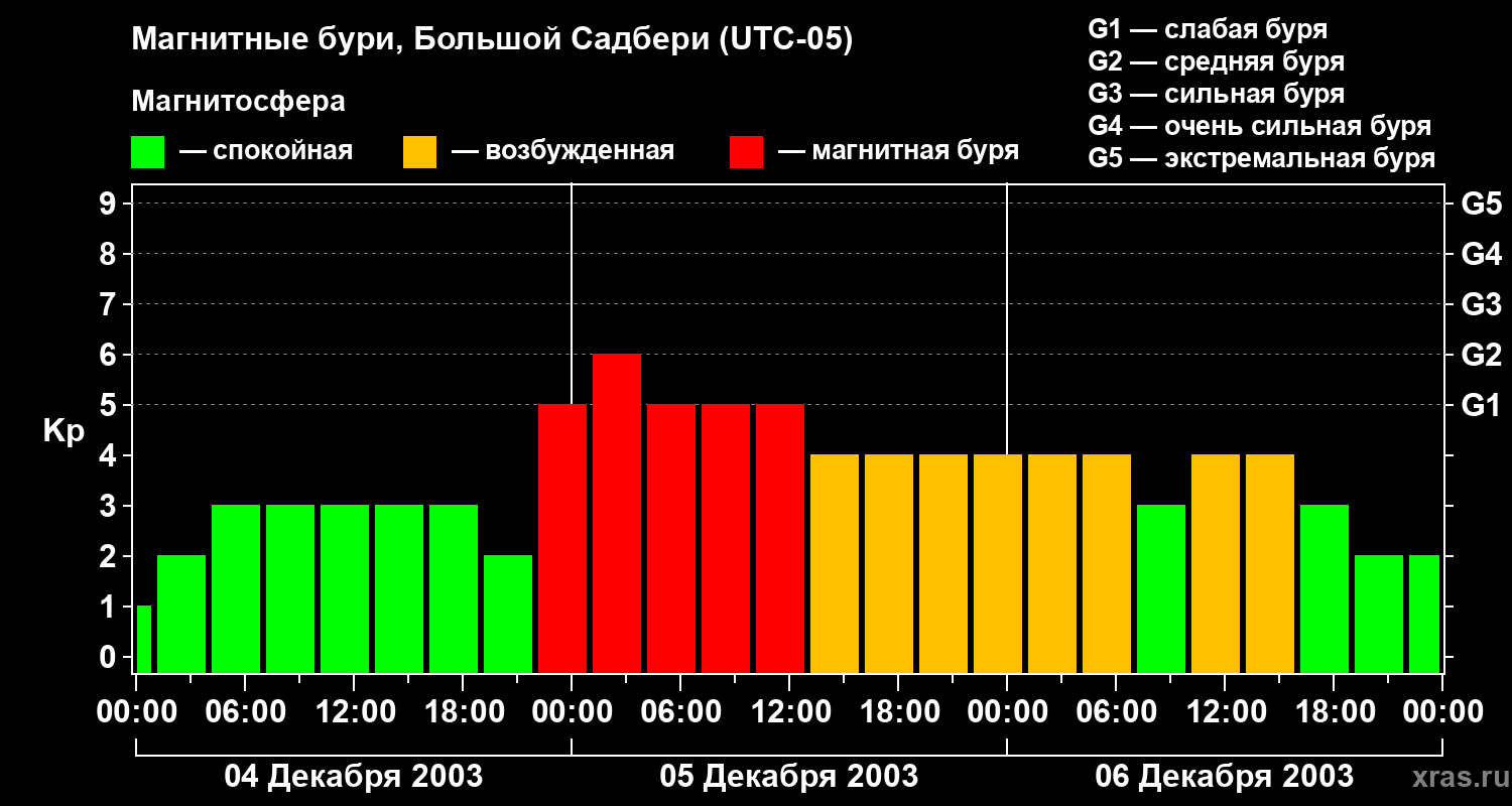 Изменения геомагнитного индекса Kp с 4 по 6 декабря 2003 года для средних широт