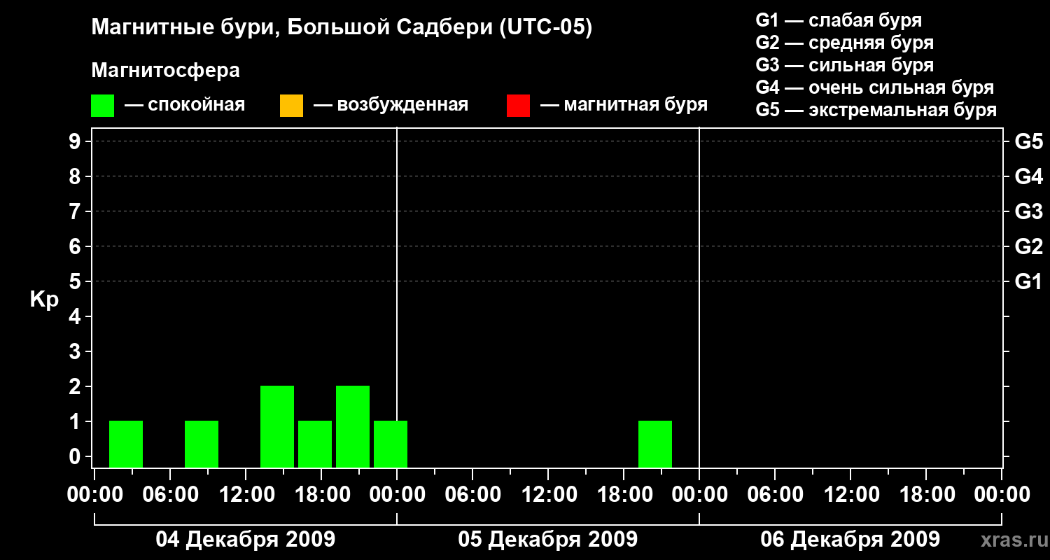 Изменения геомагнитного индекса Kp с 4 по 6 декабря 2009 года для средних широт