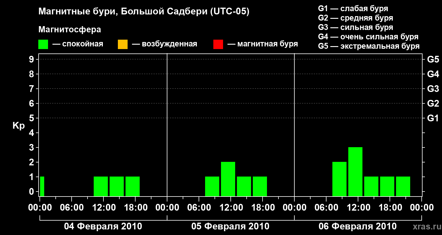 Изменения геомагнитного индекса Kp с 4 по 6 февраля 2010 года для средних широт