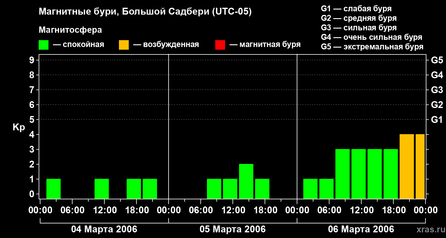 Изменения геомагнитного индекса Kp с 4 по 6 марта 2006 года для средних широт