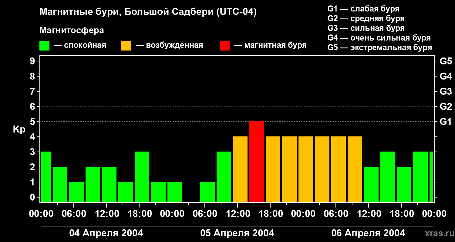 Изменения геомагнитного индекса Kp с 4 по 6 апреля 2004 года для средних широт