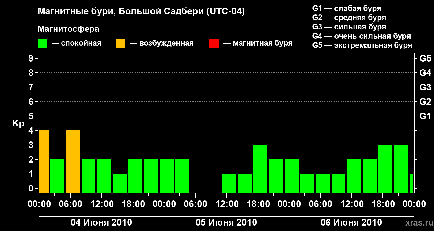 Изменения геомагнитного индекса Kp с 4 по 6 июня 2010 года для средних широт