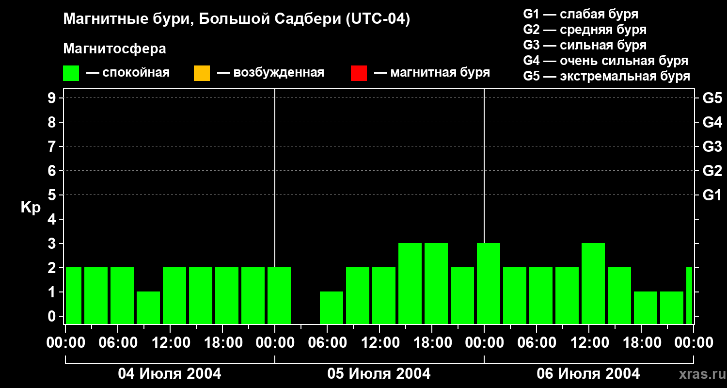 Изменения геомагнитного индекса Kp с 4 по 6 июля 2004 года для средних широт