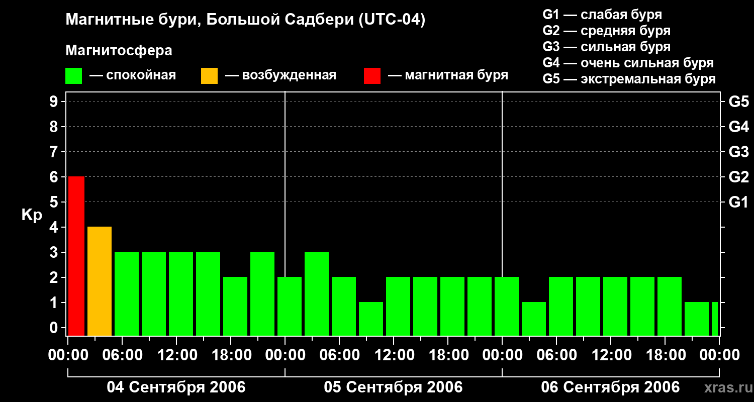 Изменения геомагнитного индекса Kp с 4 по 6 сентября 2006 года для средних широт