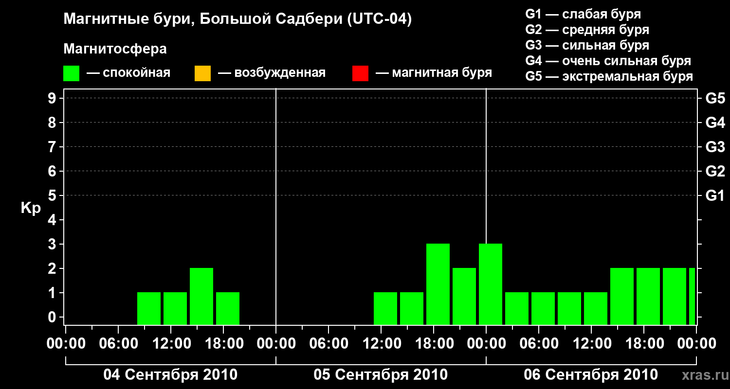 Изменения геомагнитного индекса Kp с 4 по 6 сентября 2010 года для средних широт
