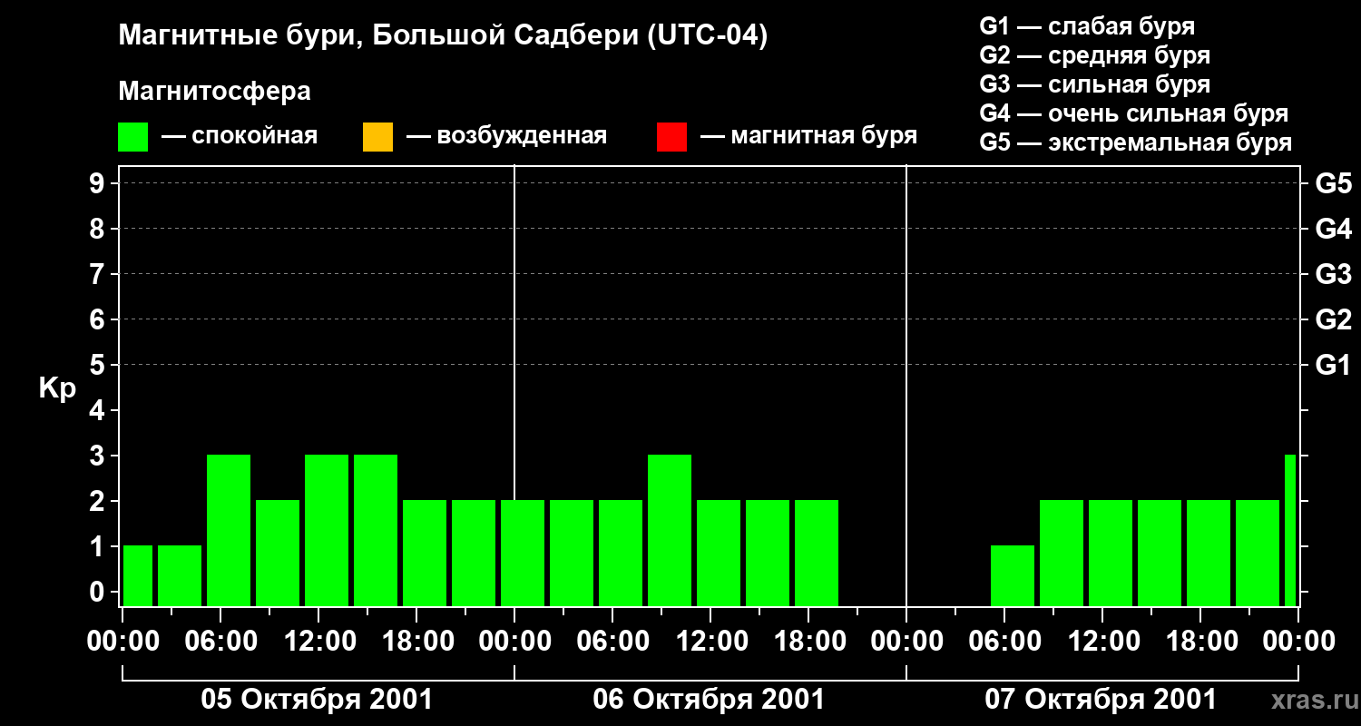 Изменения геомагнитного индекса Kp с 5 по 7 октября 2001 года для средних широт
