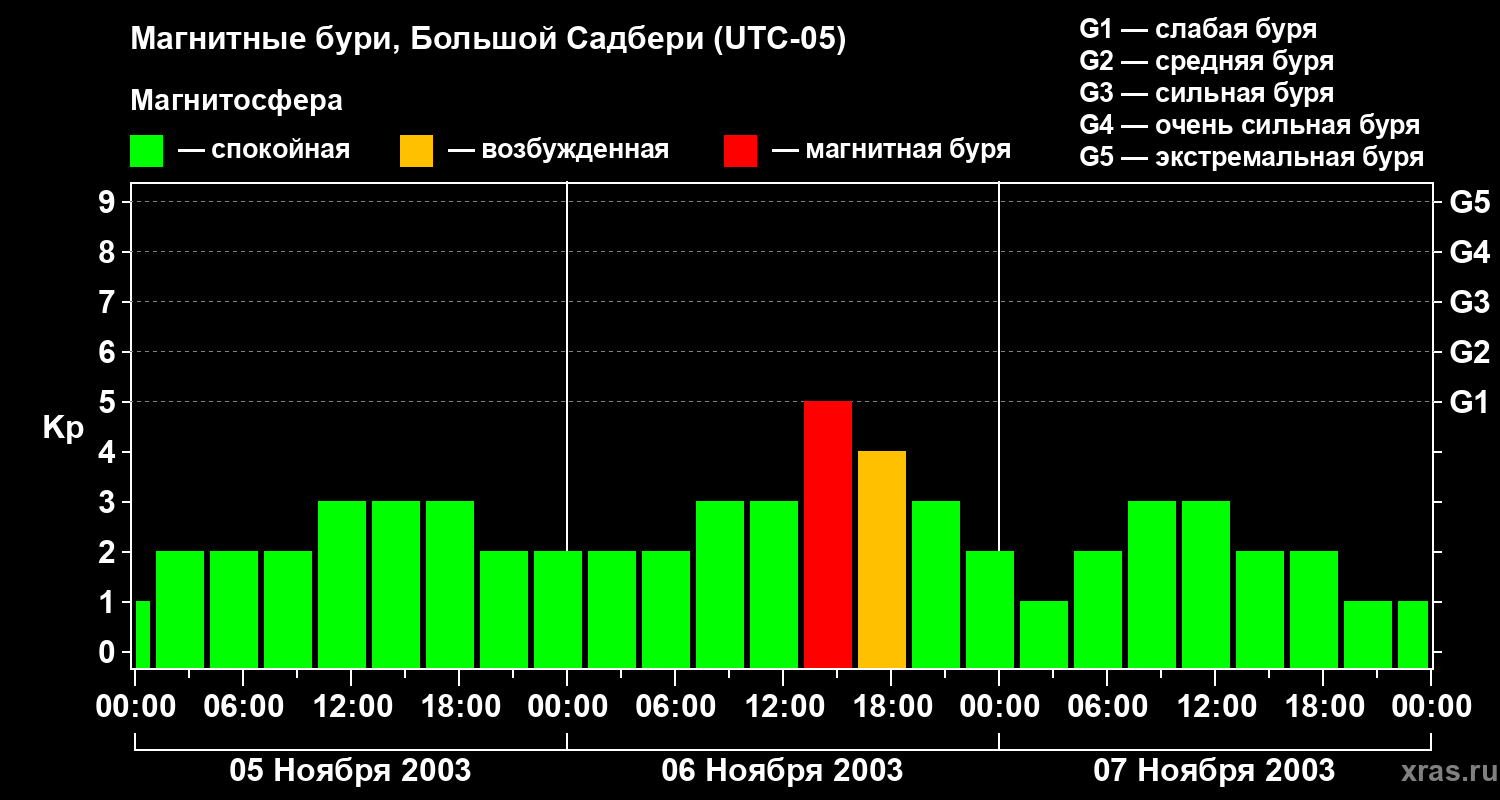 Изменения геомагнитного индекса Kp с 5 по 7 ноября 2003 года для средних широт
