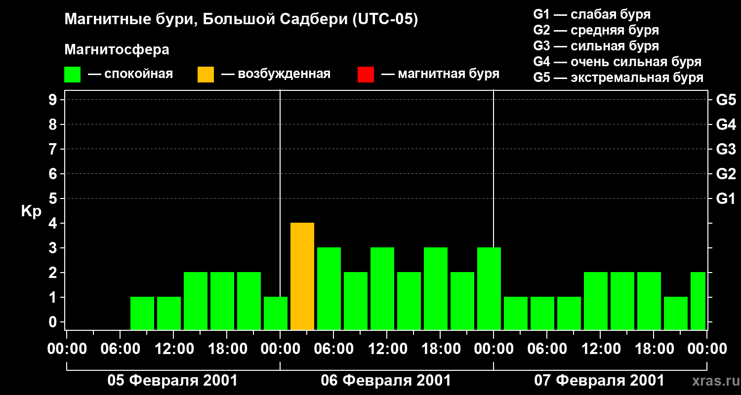 Изменения геомагнитного индекса Kp с 5 по 7 февраля 2001 года для средних широт