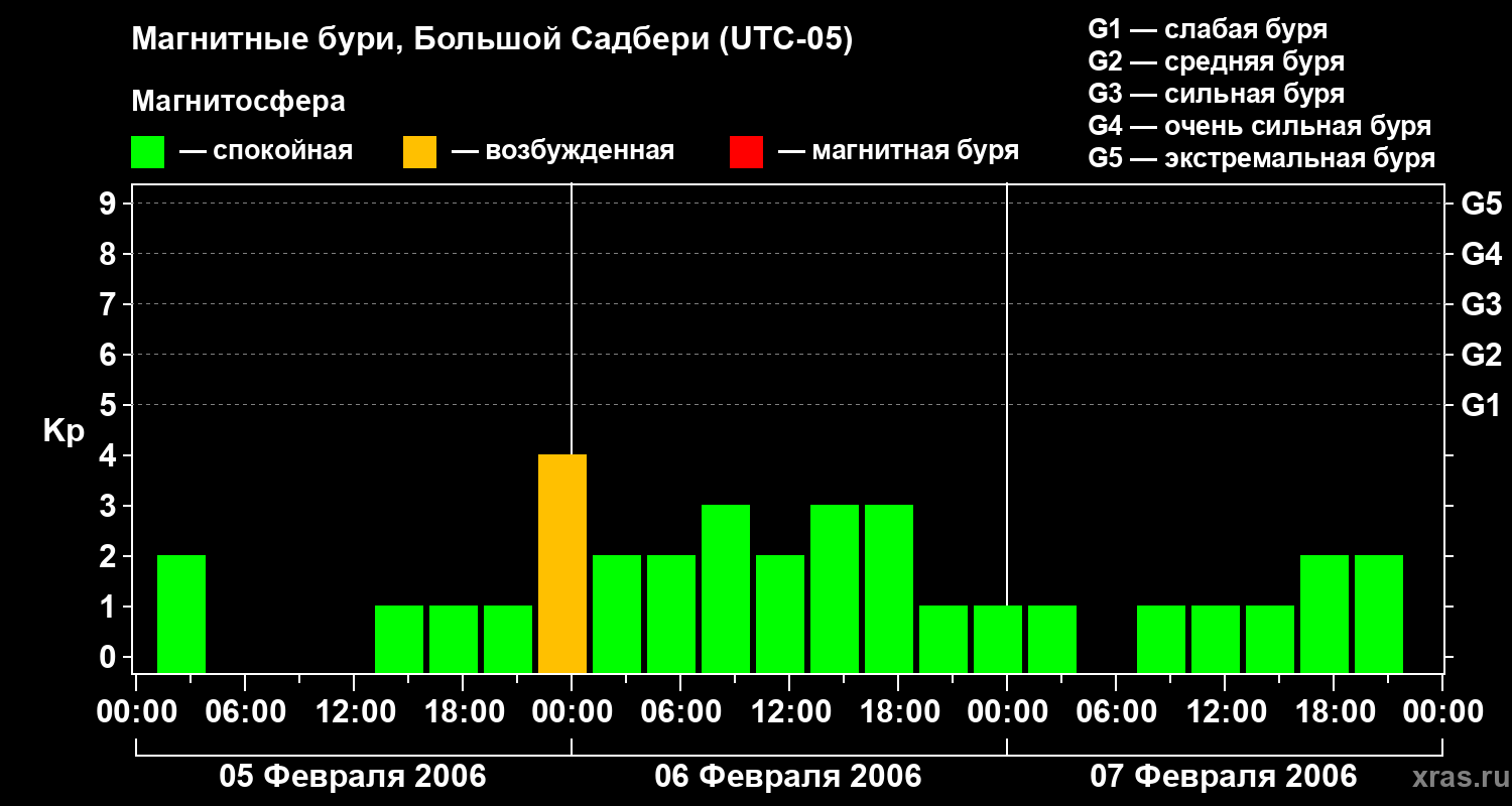 Изменения геомагнитного индекса Kp с 5 по 7 февраля 2006 года для средних широт
