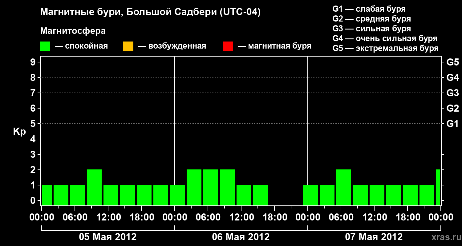 Изменения геомагнитного индекса Kp с 5 по 7 мая 2012 года для средних широт