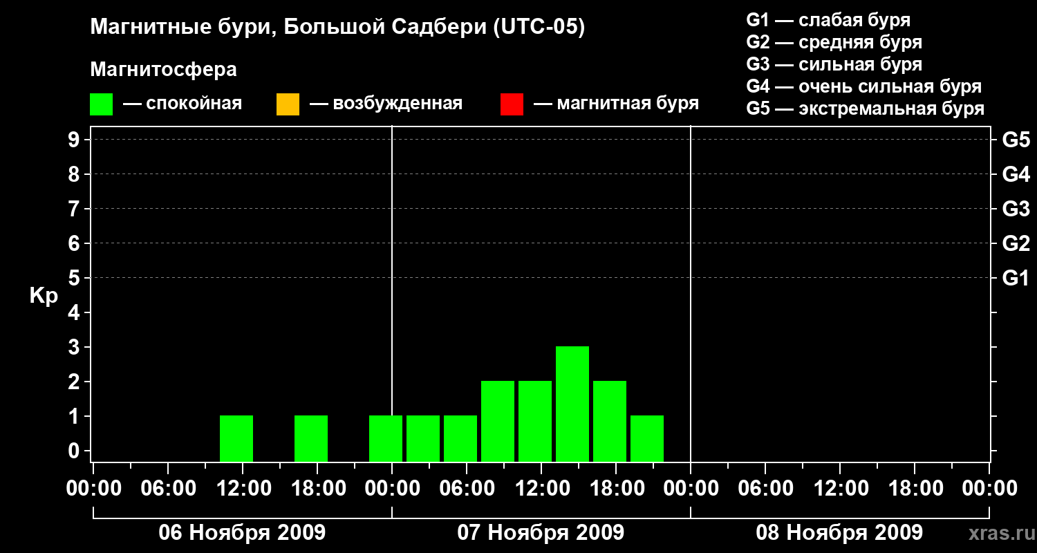 Изменения геомагнитного индекса Kp с 6 по 8 ноября 2009 года для средних широт