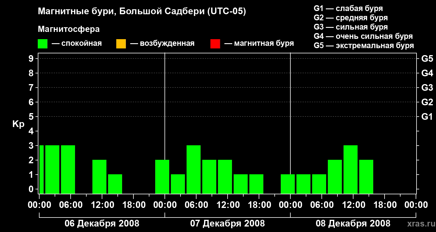 Изменения геомагнитного индекса Kp с 6 по 8 декабря 2008 года для средних широт