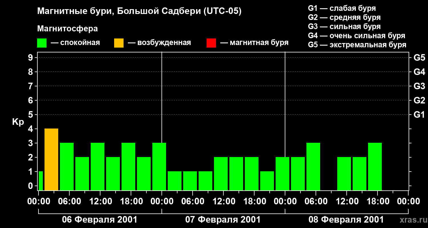 Изменения геомагнитного индекса Kp с 6 по 8 февраля 2001 года для средних широт