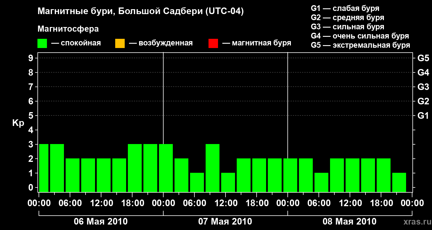 Изменения геомагнитного индекса Kp с 6 по 8 мая 2010 года для средних широт