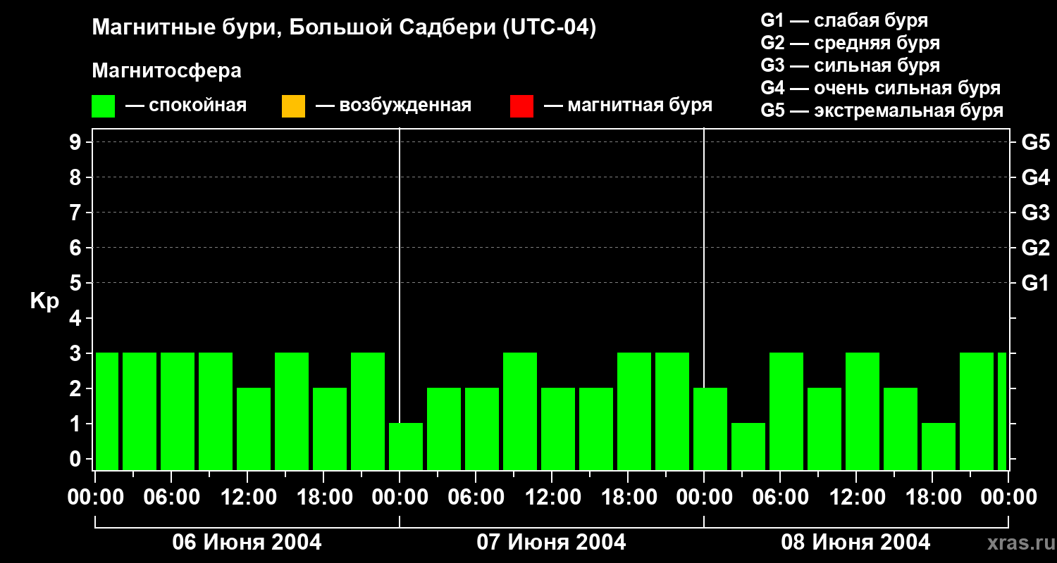 Изменения геомагнитного индекса Kp с 6 по 8 июня 2004 года для средних широт