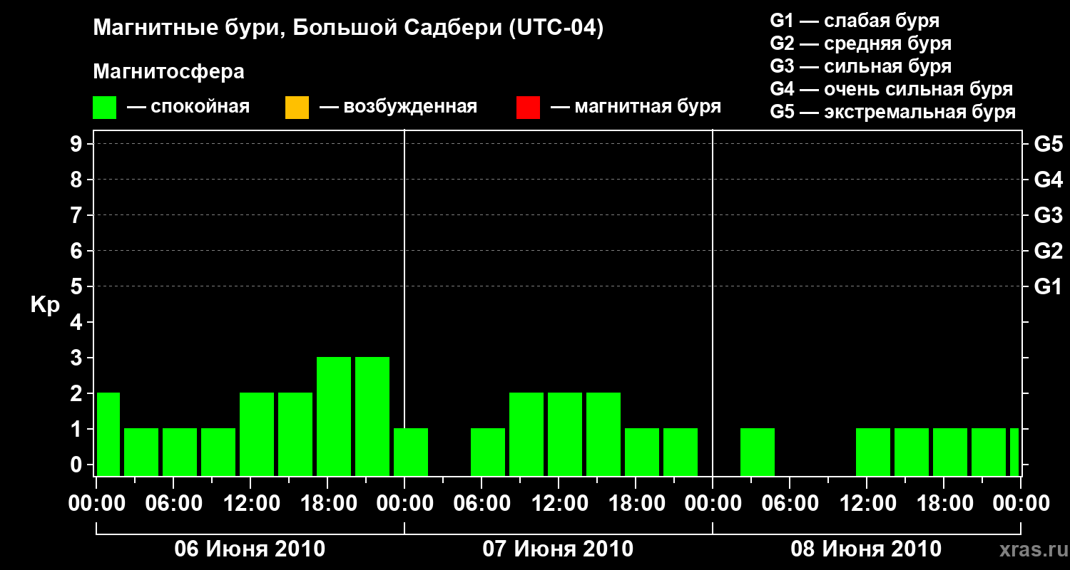 Изменения геомагнитного индекса Kp с 6 по 8 июня 2010 года для средних широт