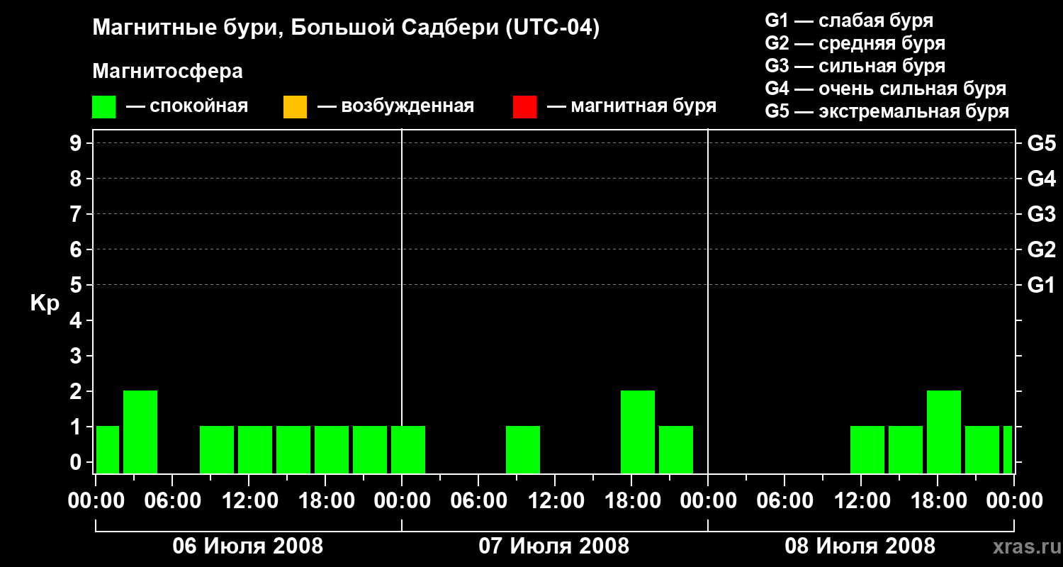 Изменения геомагнитного индекса Kp с 6 по 8 июля 2008 года для средних широт