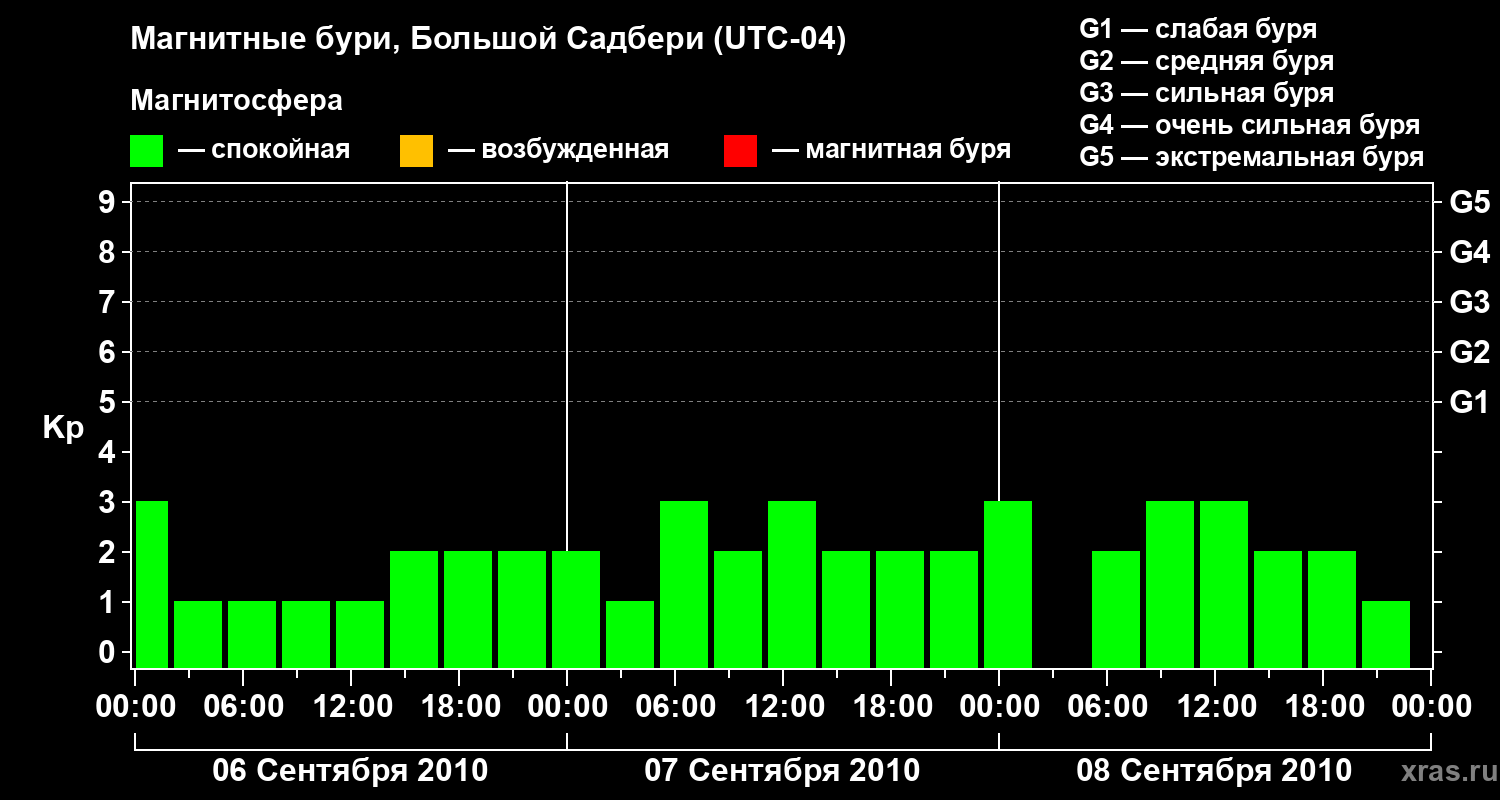 Изменения геомагнитного индекса Kp с 6 по 8 сентября 2010 года для средних широт