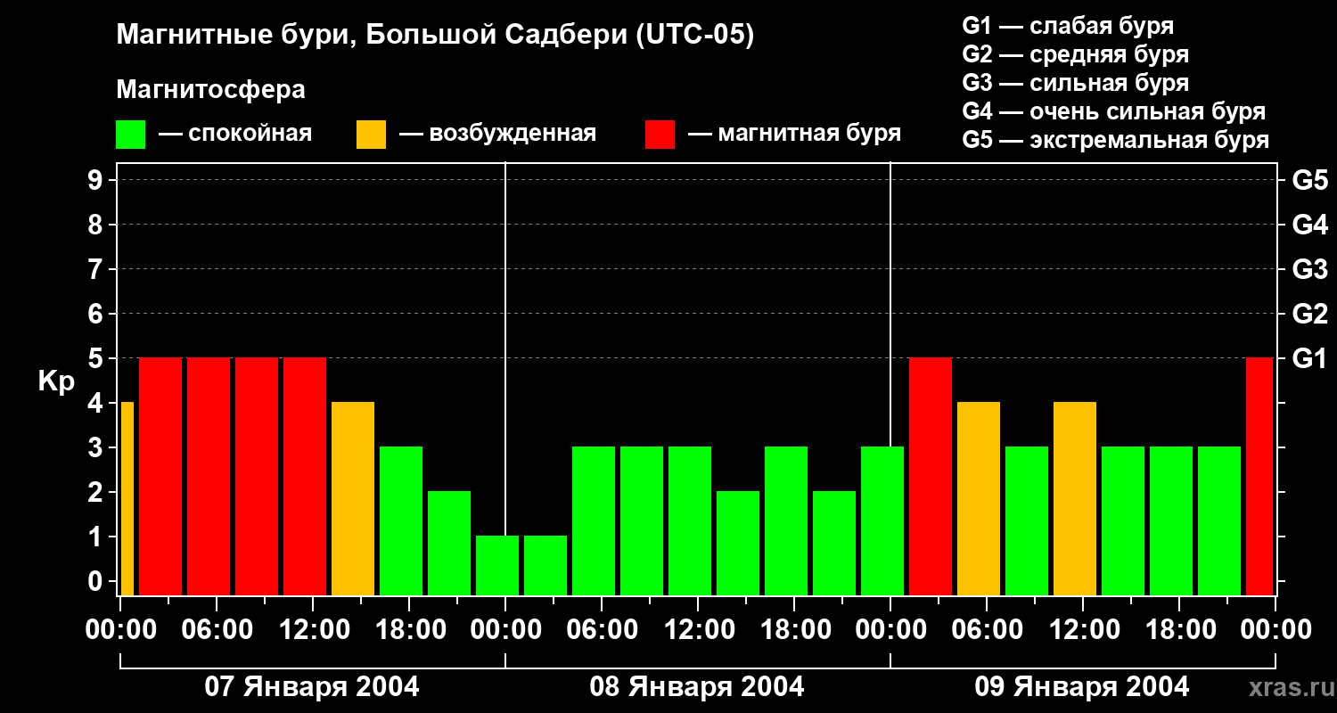 Изменения геомагнитного индекса Kp с 7 по 9 января 2004 года для средних широт