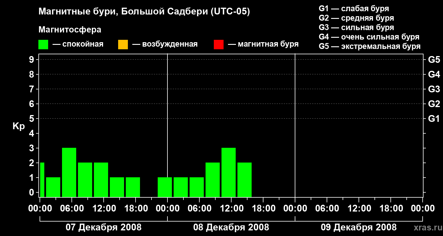 Изменения геомагнитного индекса Kp с 7 по 9 декабря 2008 года для средних широт