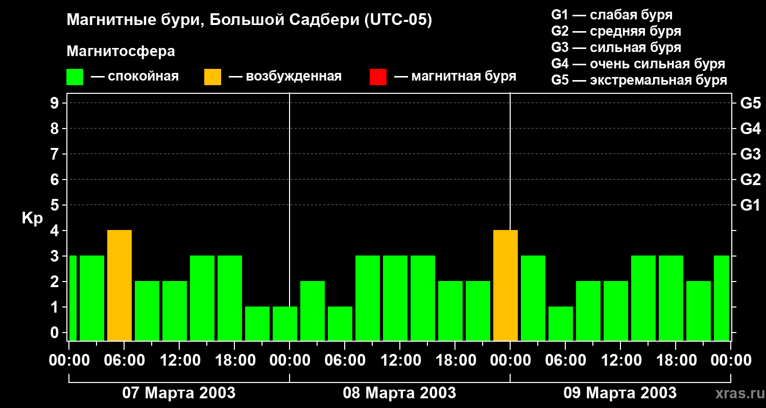 Изменения геомагнитного индекса Kp с 7 по 9 марта 2003 года для средних широт
