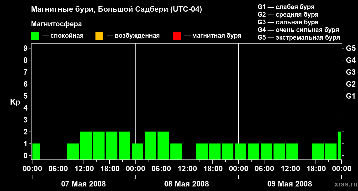 Изменения геомагнитного индекса Kp с 7 по 9 мая 2008 года для средних широт