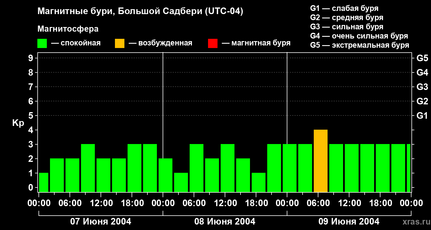 Изменения геомагнитного индекса Kp с 7 по 9 июня 2004 года для средних широт