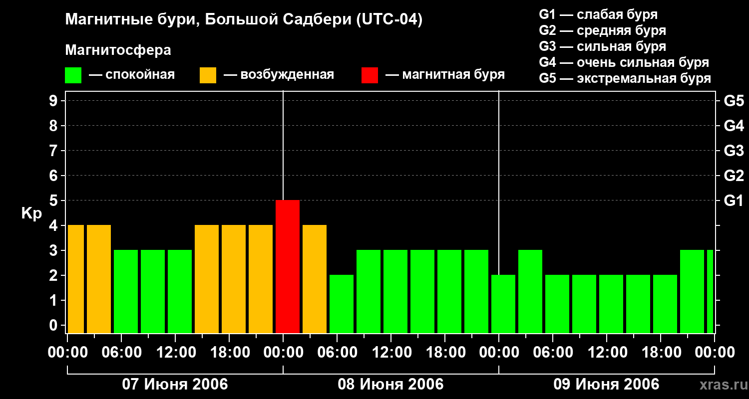 Изменения геомагнитного индекса Kp с 7 по 9 июня 2006 года для средних широт