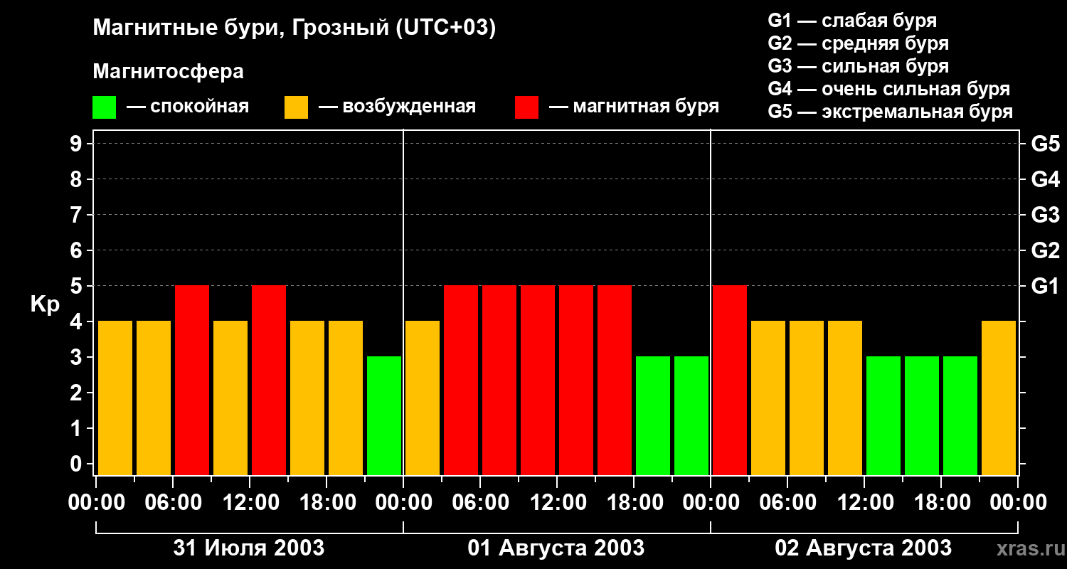 Изменения геомагнитного индекса Kp с 31 июля по 2 августа 2003 года для средних широт
