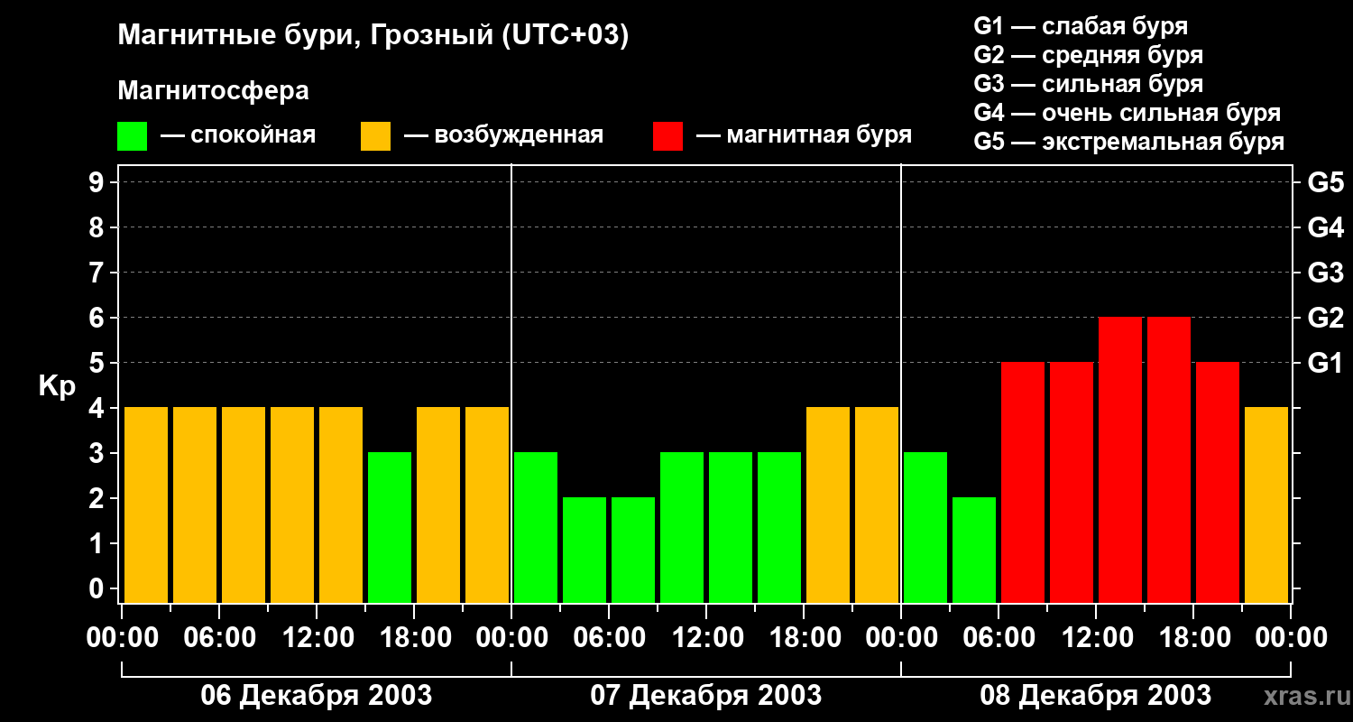 Изменения геомагнитного индекса Kp с 6 по 8 декабря 2003 года для средних широт