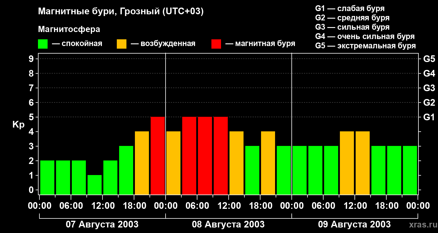 Изменения геомагнитного индекса Kp с 7 по 9 августа 2003 года для средних широт