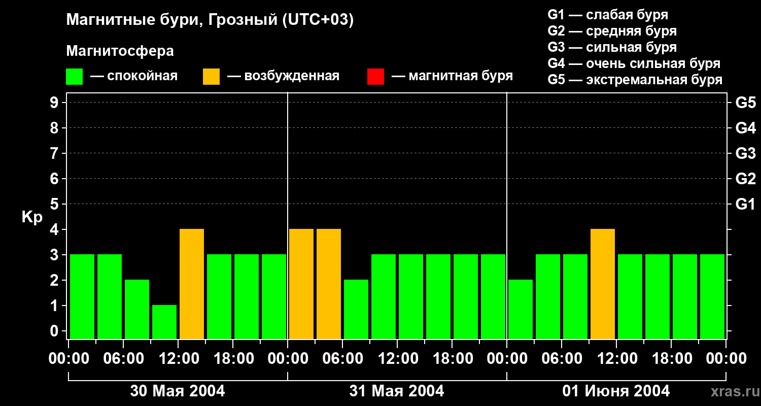 Изменения геомагнитного индекса Kp с 30 мая по 1 июня 2004 года для средних широт