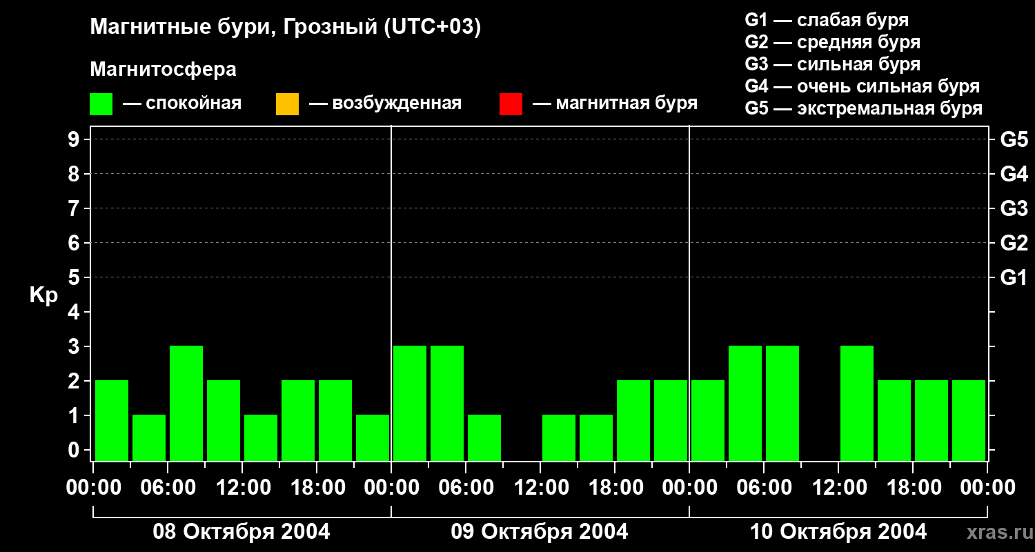 Изменения геомагнитного индекса Kp с 8 по 10 октября 2004 года для средних широт