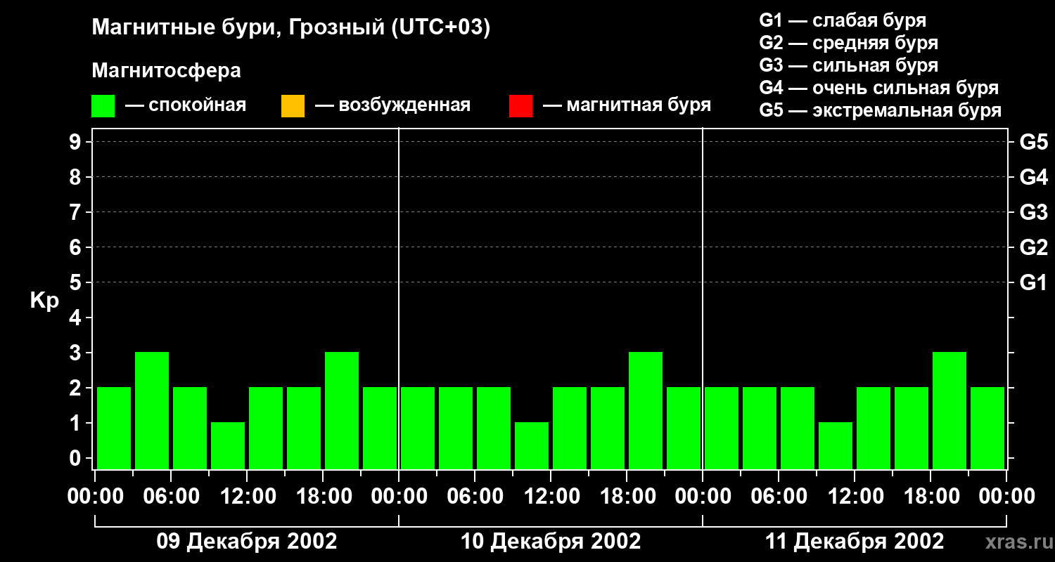 Изменения геомагнитного индекса Kp с 9 по 11 декабря 2002 года для средних широт