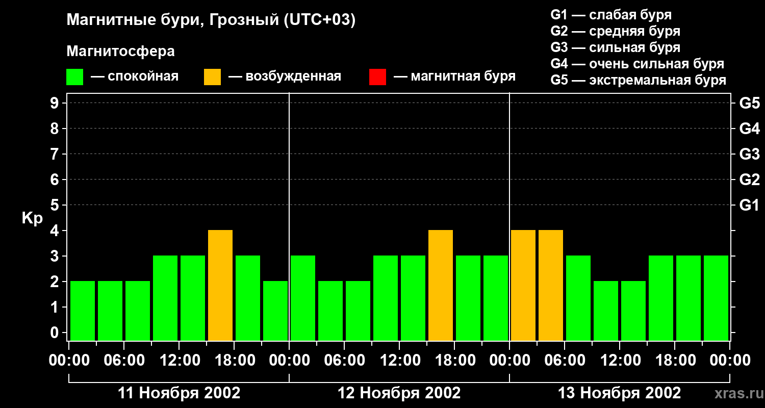Изменения геомагнитного индекса Kp с 11 по 13 ноября 2002 года для средних широт