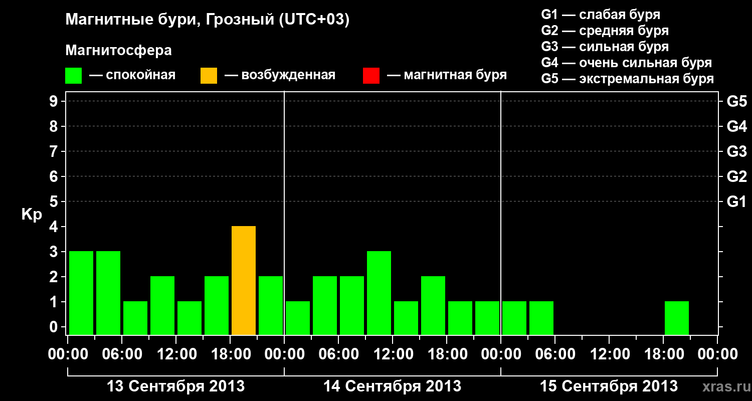 Изменения геомагнитного индекса Kp с 13 по 15 сентября 2013 года для средних широт