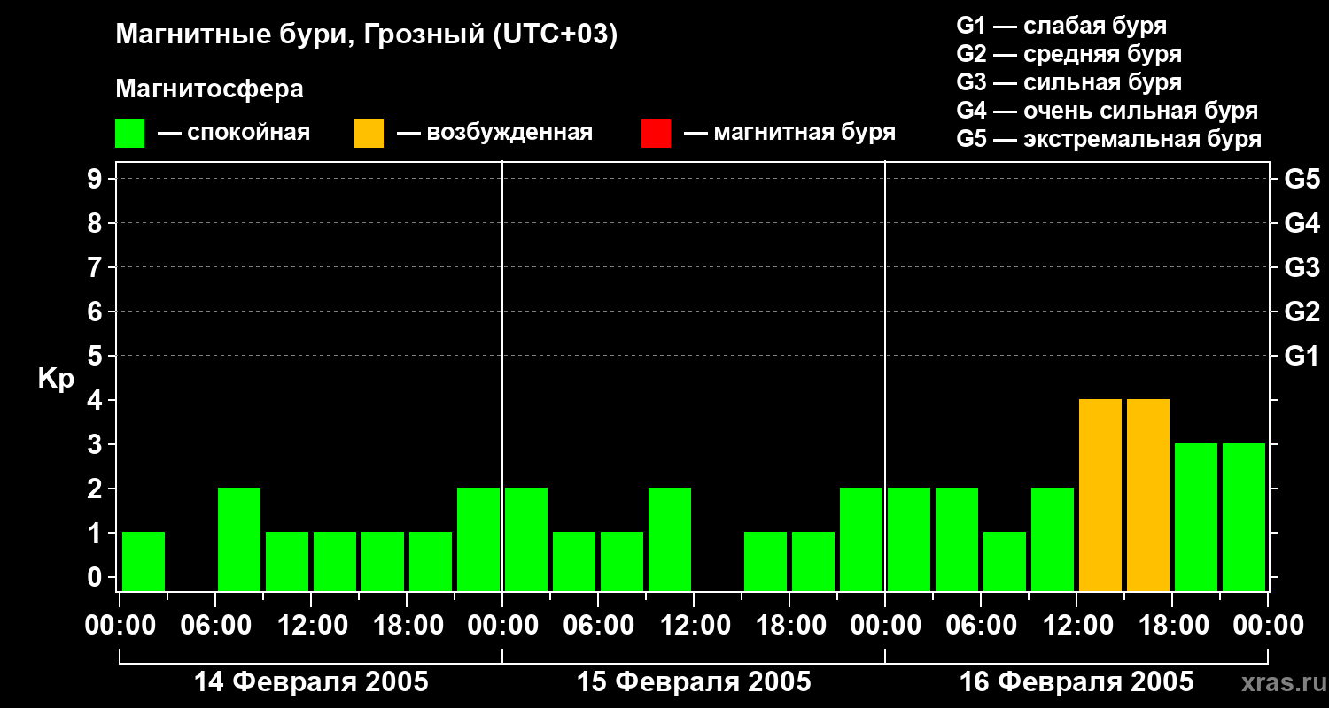 Изменения геомагнитного индекса Kp с 14 по 16 февраля 2005 года для средних широт