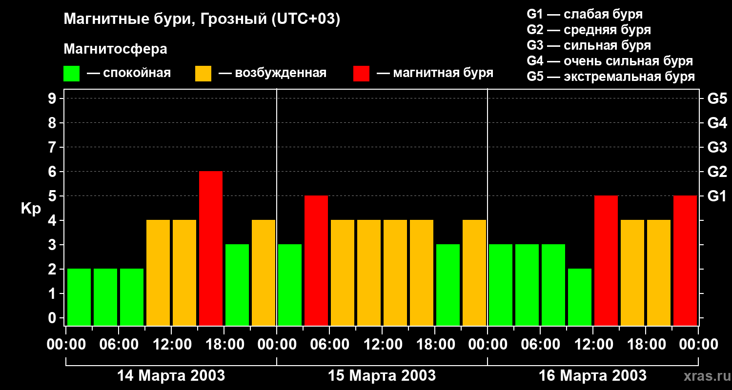Изменения геомагнитного индекса Kp с 14 по 16 марта 2003 года для средних широт